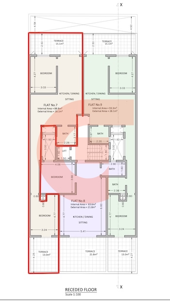 The property measures 88.8 sqm internal area and 28.1 sqm external area and comprises a bright open plan kitchen, dining and living area leading onto a front terrace measuring approximately 15.1 sqm, ideal for outdoor dining and entertaining.